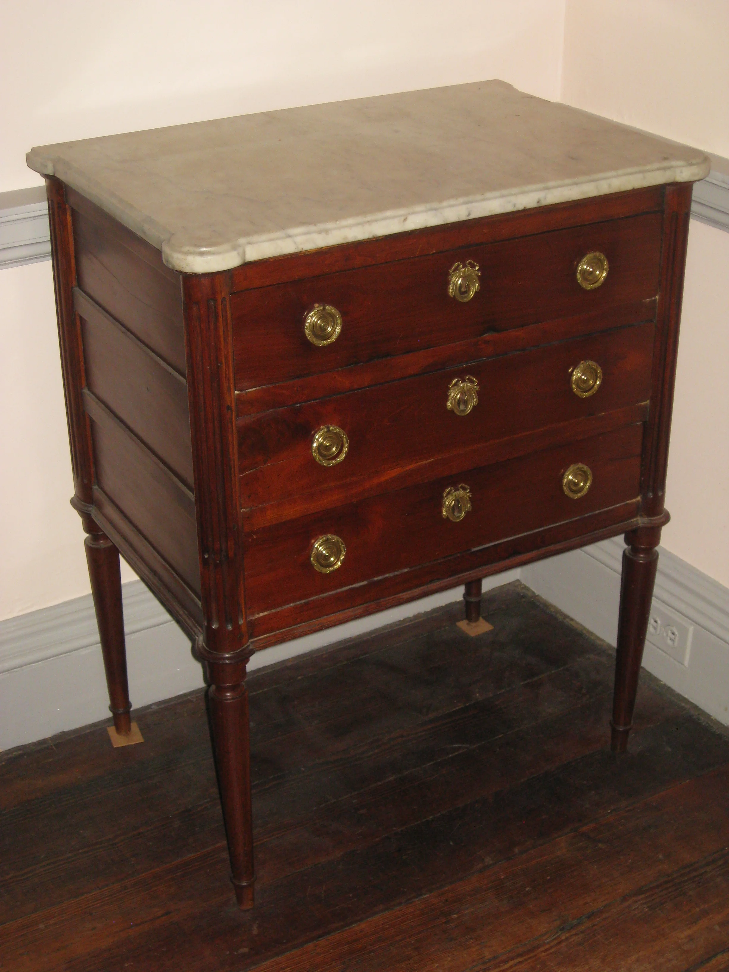 Louis XVI mahogany commode, beneath a white marble top with projecting rounded corners, having three drawers, fitted with brass ring handles; the corners having engaged fluted columns, the sides paneled; raised on tapered legs. French, late 18th cent. H. 34 inches, W. 27 inches, D. 18 ¼ inches.