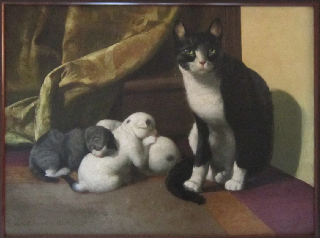 Beard, James Henry (American 1811-1893), Cat Family at Home. Oil on canvas, depicting a mother cat and three new born kittens gathered in a mound beside her on the edge of a carpet, with a step and heavy drapery behind. Signed in the lower right "Jas H Beard N.A." 17 3/4 x 23 7/8 inches. Condition: Re-lined and on original stretcher, with minor inpainting and some craquelure. NB: Beard was an honorary member of the National Academy of Design 1848-60 and a full member 1872-93.