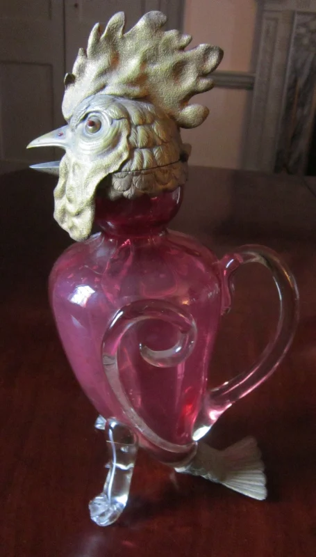 Red glass claret jug, having internal vertical ribs, the hinged gilt bronze top in the form of a rooster’s head with open beak and with red glass eyes and nostrils; having a clear glass handle and rudimentary “wings”; and supported on clear glass rooster legs with spurs and modified claws; and a gilt bronze rooster’s tail. French, ca. 1880. H. 14 inches. Condition: chips to claws, some wear to gilding. Provenance: Ex collection Melvin P. Billups (b. 1879), who donated a 3,000 piece collection of ancient to modern glass to the New Orleans Museum of Art.