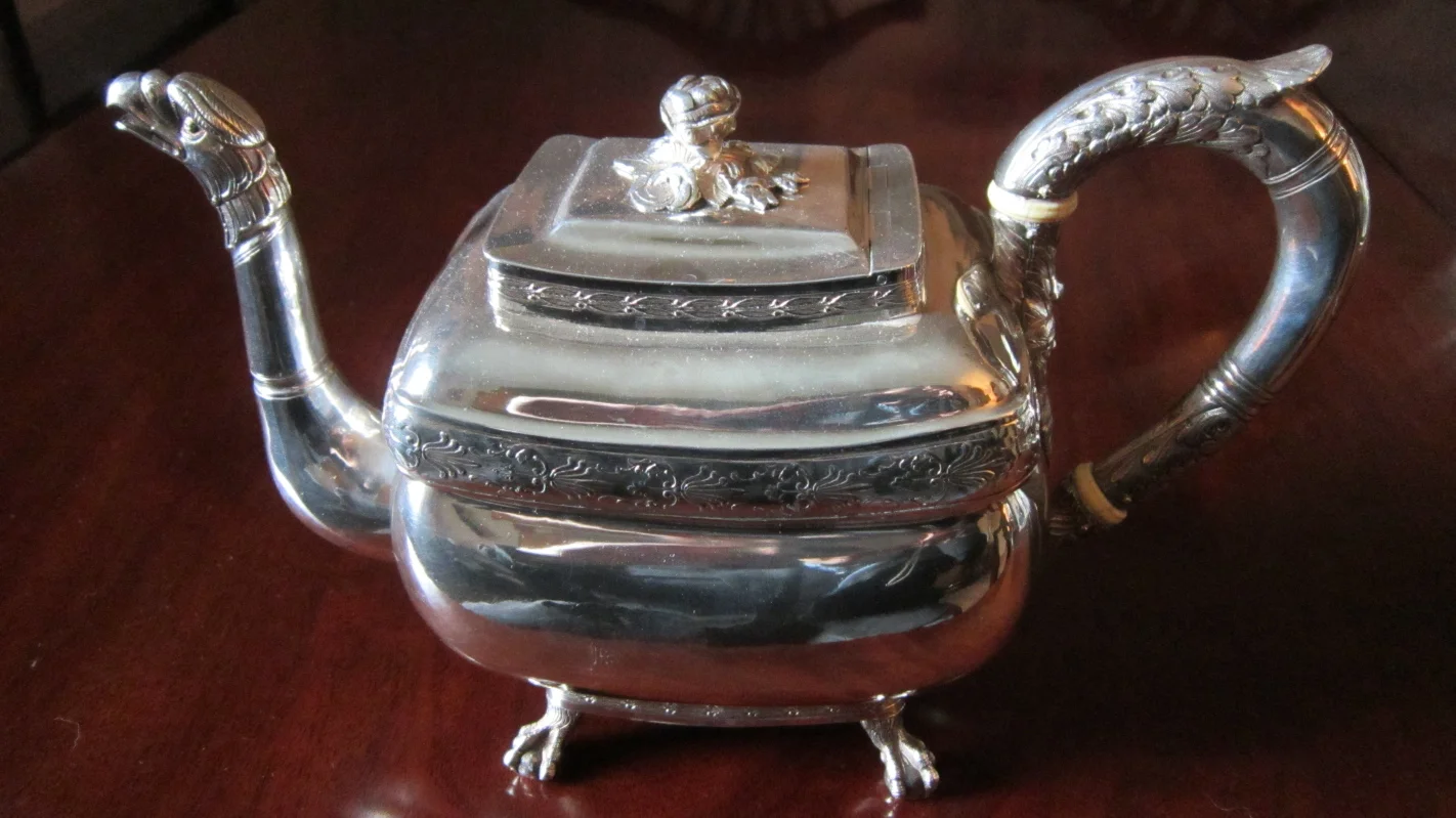 Anthony Rasch silver teapot of squared form, raised on bird claw feet, decorated with die stamped bands of laurel leaves and anthemia; having an eagle head spout, a curved handle with ivory insulator rings and terminating in bearded masks, and a hinged lid with a bouquet of roses finial. Marked on the base "ANTy. Rasch." The base also engraved “Henry Tucker born/ July 25 1815.” Philadelphia, ca. 1815. H. 7 ¼ Inches, L. 11 ¼ inches. 29 troy oz.