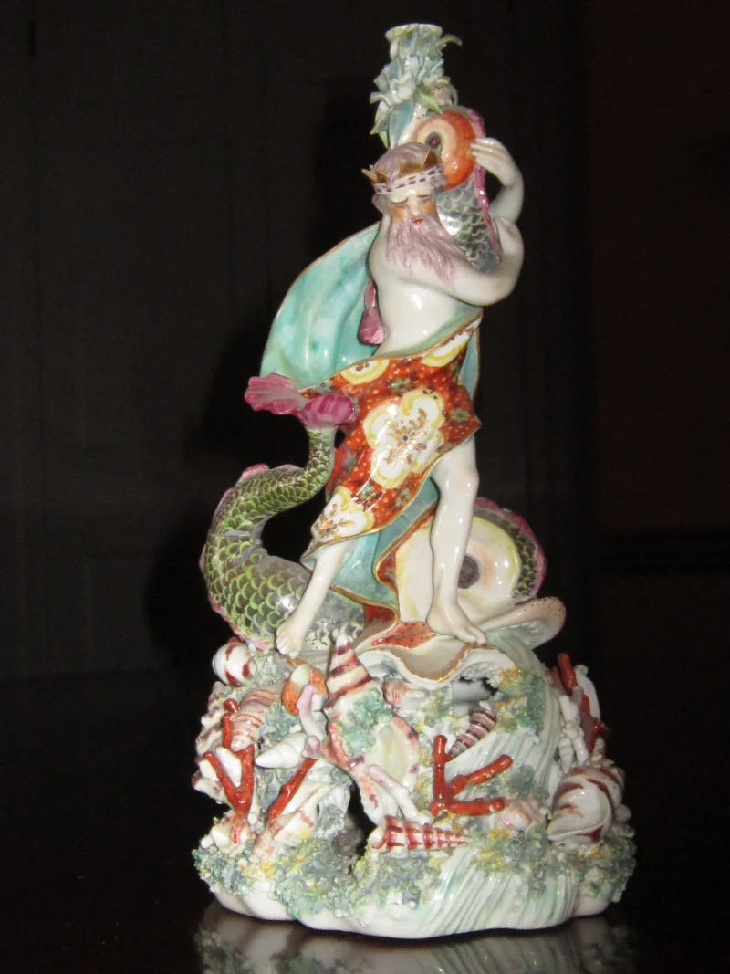 Derby polychrome porcelain figural candlestick, highlighted with gilding, depicting Neptune standing in a dramatic contrapposto pose, beside a dolphin spewing water, and holding a second, smaller dolphin also spewing water, the applied water jets hiding a small cup intended to hold a bolt for a candle cup (now missing); all raised on a mounded, pierced rockery base, thickly encrusted with moss, coral and shells. The base with the telltale Derby patch marks. English, ca. 1760-65. Condition: numerous chips to water jets, small chips to seaweed and coral. Provenance: Ex Colin Harper Collection of Shells in Pottery and Porcelain, sold Phillips, London, Jan. 1990. NB: Neptune is inspired by a Baroque bronze bust by Michel Anguier (1612-1686).