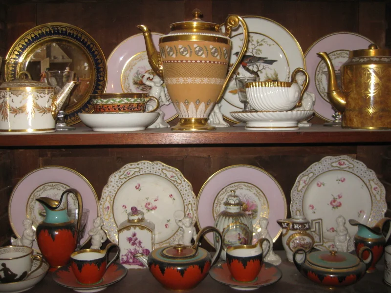 Bottom shelf, L to R: Teacup and saucer with gilt and bronzed decoration. Paris, ca. 1825; Berlin cabaret in the Pompeian taste, decorated in orange, turquoise and silver. German, ca. 1810; Pair of Derby dinner plates decorated after Sèvres with roses and oeils de perdrix. English, ca. 1790; Nymphenburg rectangular, shouldered tea canister, the Chinoiserie decoration executed outside the factory in gilt and purpur camaieu. German, ca. 1775; Worcester Flight & Barr fluted vase-shaped tea canister, with a reserve of fancy birds. English, ca. 1785; Marcolini Meissen miniature coffee pot with a hunting scene reserve. German, ca. 1780.